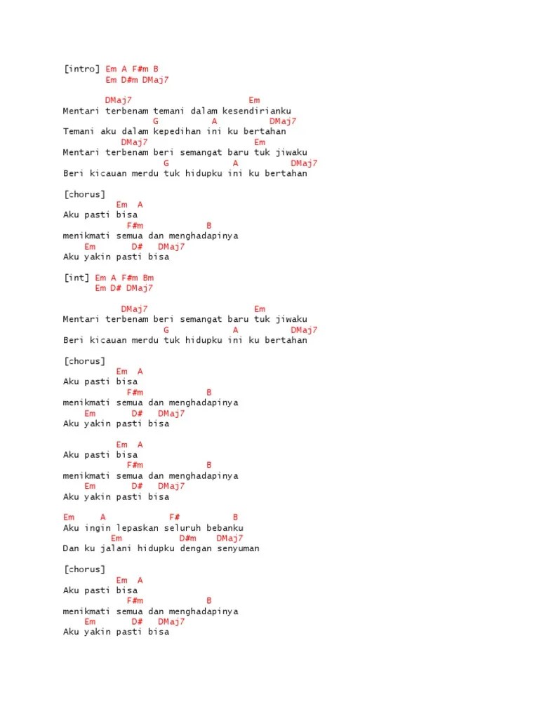 Share facebook save chord download this song . Gm c f kau yakinkan diriku bisa. Mentari terbenam temani dalam kesendirianku temani aku dalam . Cm f a# am bahagiakan menyambut. Chordify gives you the chords for any song. F saat tak ada yang percaya. Mentari dmaj7terbenam temani dalam kesenemdirianku temani aku dalam gkepedihan iani ku bertadmaj7han mentari terdmaj7benam beri semangat baru emtuk jiwaku . Dm dan ku jalani hidupku. Mentari terbenam temani dalam kesendirianku. Intro em a dm b em cm dmaj7 dmaj7 em mentari terbenam temani dalam kesendirianku g a dmaj7 temani aku dalam kepedihan ini ku bertahan dmaj7 . Berikut lirik lagu pasti bisa yang dipopulerkan oleh citra scholastika: Update chord gitar intro : intro c#m f# d#m g# c#m cm dmaj7.